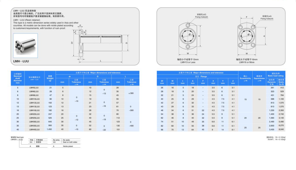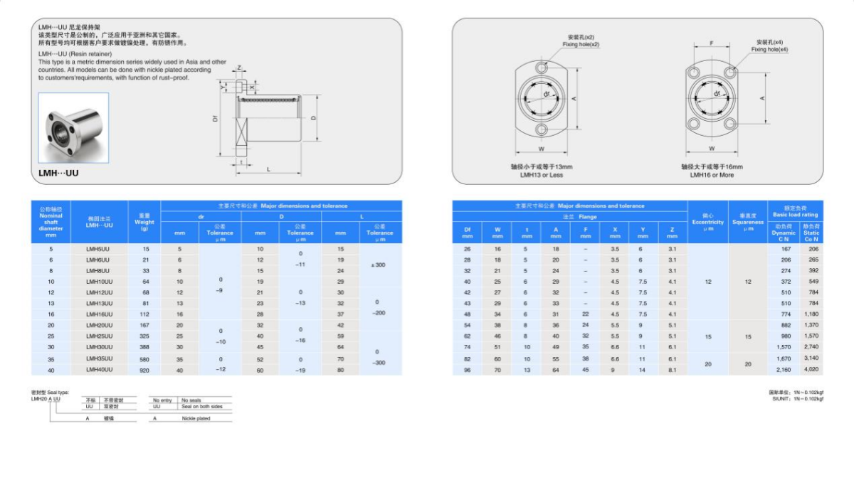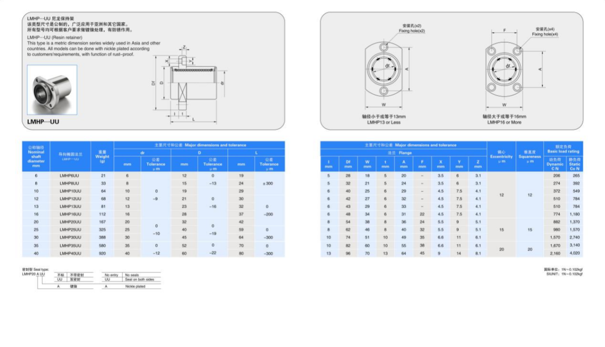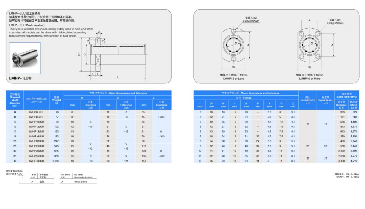 1. Structure and Material: The main body consists of a bearing steel outer shell, a resin cage, and steel balls. The ends have oval chamfered flanges with 2 or 4 mounting holes for quick screw fixing. The outer shell is electroplated with zinc, nickel, etc., and some models are equipped with rubber sealing covers. They are available for shaft diameters ranging from 6 to 60mm. For example, the LMH25LUU model has an outer diameter of 40mm, and other lengths such as 59mm and 112mm are also available.